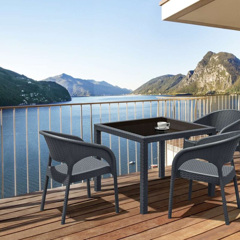 The Bali Table, meticulouslycrafted in Europe by Siesta, showcases high-quality polypropylene reinforcedwith fiberglass, ensuring unrivalled durability. The addition of a sleek blacktempered glass insert elevates the aesthetic while maintaining resistance to UVrays, making it the perfect centrepiece for indoor and shaded outdoor commercialspaces.