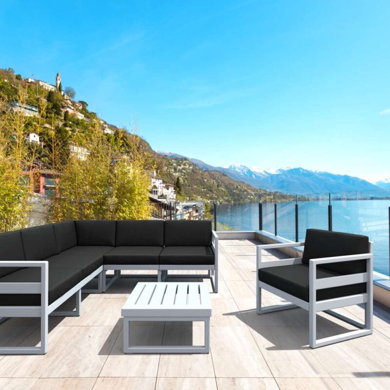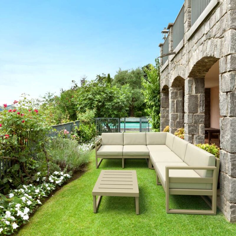The cushions of the Mykonos Lounge Corners are crafted from quality Etisilk fabric from Spain, ensuring both comfort and longevity. With 100% Olefin fabric and polyester foam filling, these cushions are UV and weather resistant, providing luxurious comfort that lasts. Backed by a 2-year warranty and produced in a factory accredited to ISO environmental standards, these cushions prioritise sustainability without compromising on quality.